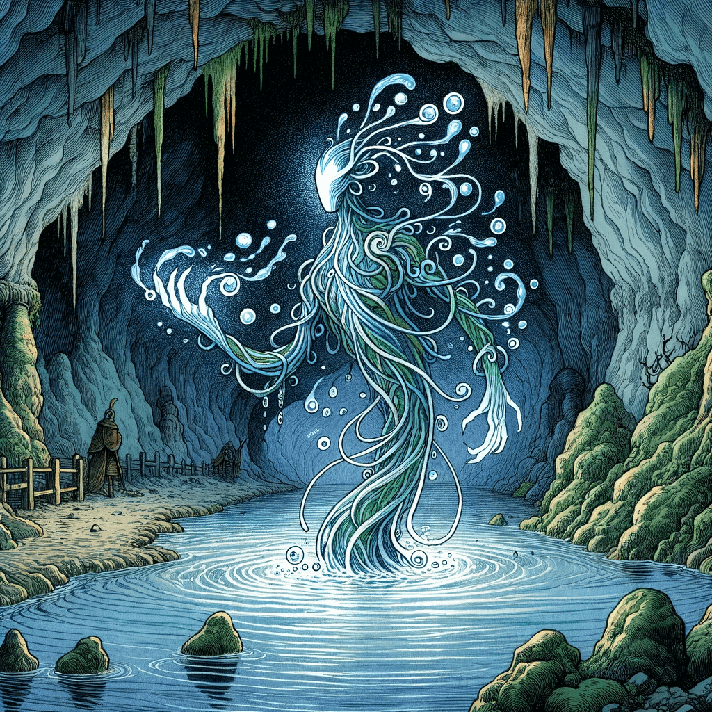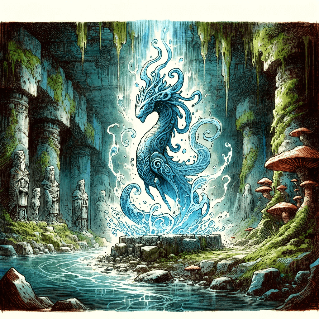 Das Wasserelementar kann verschiedenste Formen annehmen. Der Körper besteht vollständig aus fließendem, pulsierendem Wasser, wobei das Innerste von einem sanften, blauen Leuchten durchzogen ist. Je nach Stimmung und Umgebung kann das Wasser in seinem Körper von kristallklar bis zu tiefen Ozeanblau variieren, und es bildet oft Wirbel und Strudel, die wie Bilder auf seiner Haut erscheinen.