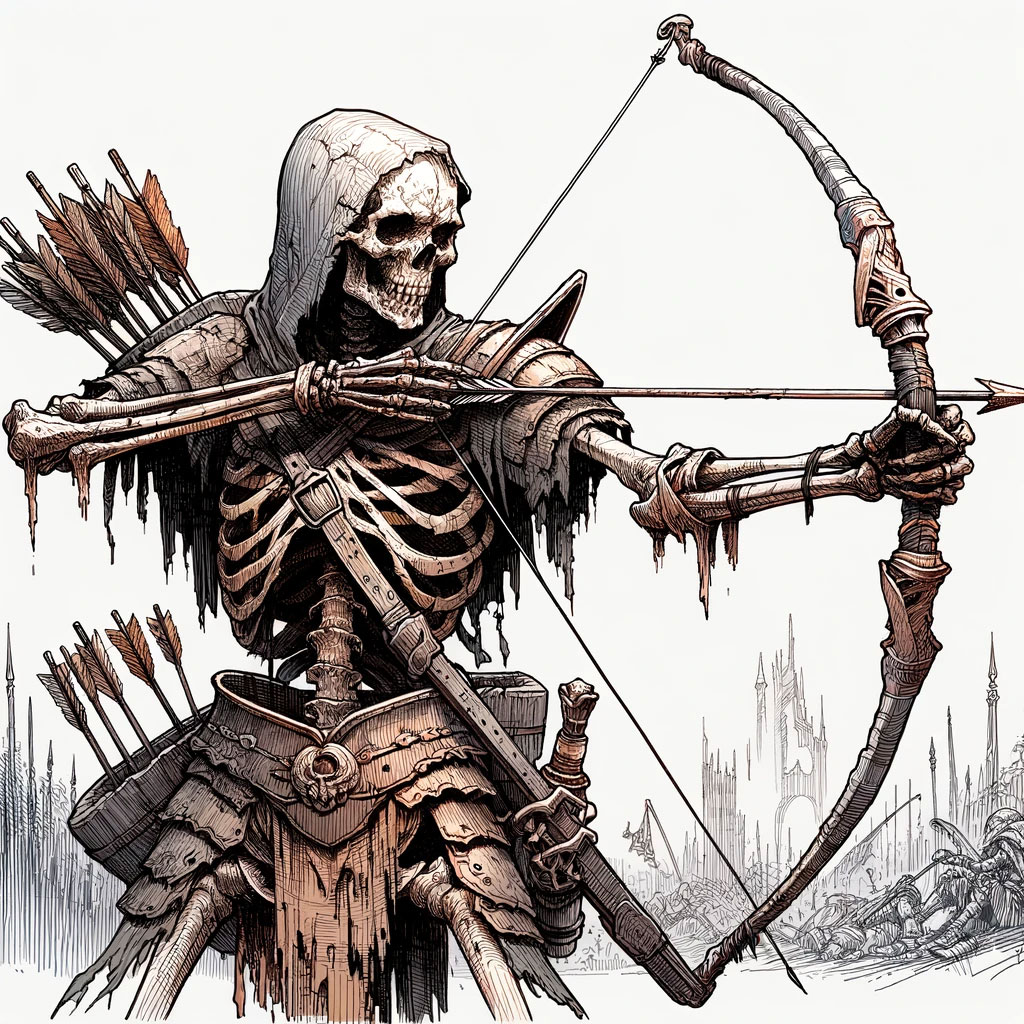 Es wird gemunkelt, dass die Seelen der Skelettbogenschützen an ihre Knochen gebunden sind durch einen Fluch, der ihnen keine Ruhe im Jenseits gewährt. Legenden erzählen, dass die Pfeile dieser Kreaturen mit dem Hass und Leid ihrer einstigen Leben imprägniert sind, was ihnen eine unnatürlich tödliche Wirkung verleiht.