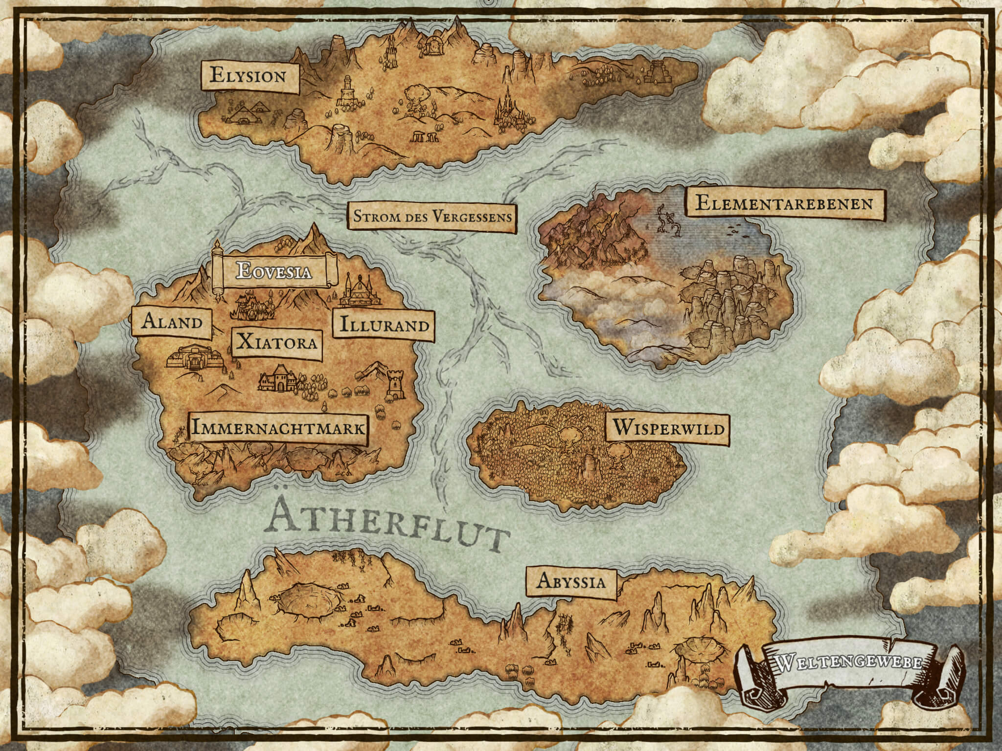 Die Welt von Eovesia ist ein Panoptikum vielfältiger und wundersamer Landschaften, jede durchtränkt mit Magie und Mysterien. Hohe, eisbekrönte Gebirge erheben sich neben tiefen, grünen Tälern, in denen der Wind Mythen der alten Zeit zuflüstert. Endlose Ebenen, von wilden Flüssen durchzogen, erstrecken sich bis zu den Horizonten, wo der Himmel die Erde in einem ewigen Tanz berührt. Dunkle, dichte Wälder, deren Bäume wie alte Wächter flüstern, grenzen an leuchtende Meere, die unter der Sonne funkeln und in der Nacht mit phosphoreszierendem Leben leuchten. Jedes Gefilde birgt seine eigene Art von Kreaturen und Geheimnissen, und die Abenteurer, die sich in diese Gebiete wagen, finden Orte, an denen die Schleier zwischen den Welten dünn sind und das Wirkliche mit dem Unmöglichen verschmilzt.