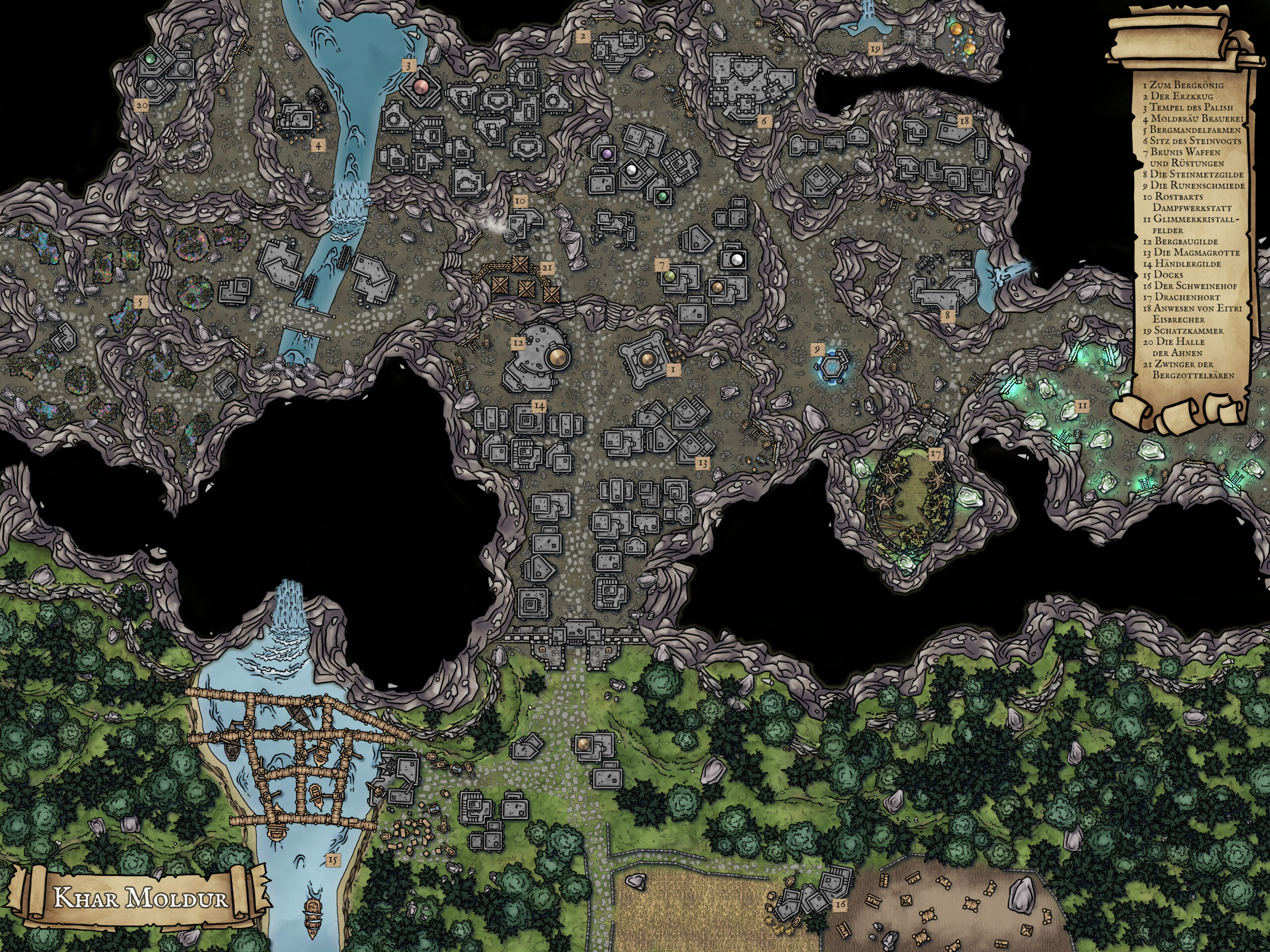 Khar Moldur, eine stolze unterirdische Zwergenstadt im Norden von Kastonia und bekannt für ihre tiefen Minen und die meisterhafte Erzgewinnung. Diese Siedlung, eingebettet in den Ausläufern des weißen Rückens, besticht durch ihre beeindruckende Architektur und fortgeschrittenen Schmiedekünste. Khar Moldur ist ein Ort voller Geschichte und reich an zwergischer Kultur. Von außen ist sie lediglich durch ein großes Schwarzes Tor sichtbar.