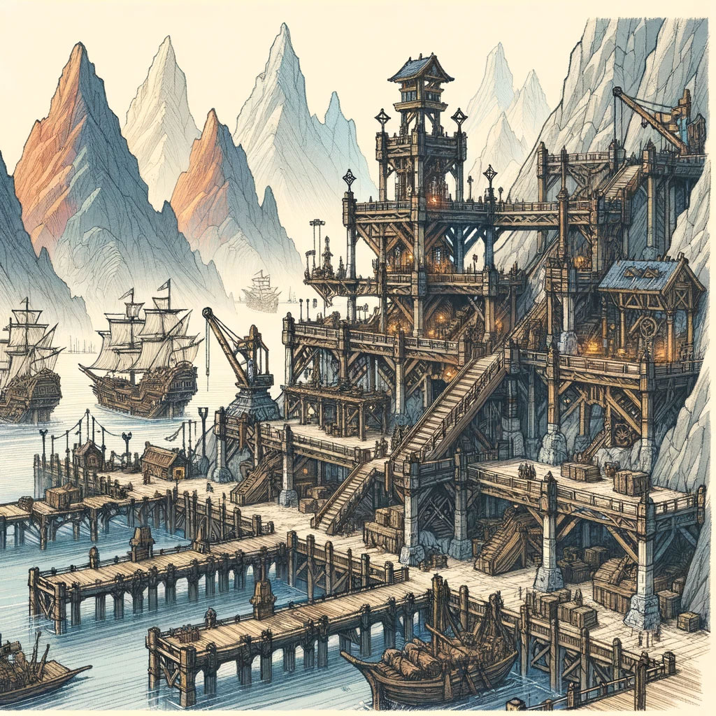 An den steilen Klippen von Khar Moldur erstrecken sich die beeindruckenden Docks, eine Meisterleistung der zwergischen Baukunst, die den rauen Bedingungen der hungernden See trotzt.