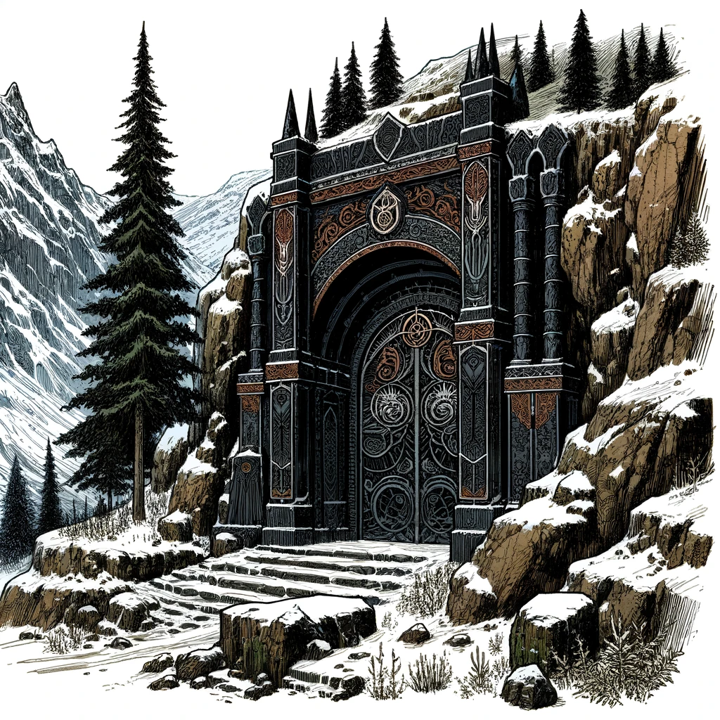 Eingebettet in die feste Bergwand erhebt sich das gewaltige schwarze Eisentor, dessen dunkle Flächen mit komplizierten Schnitzereien und Runen verziert sind, die Geschichten von Heldentum und Großtaten erzählen.