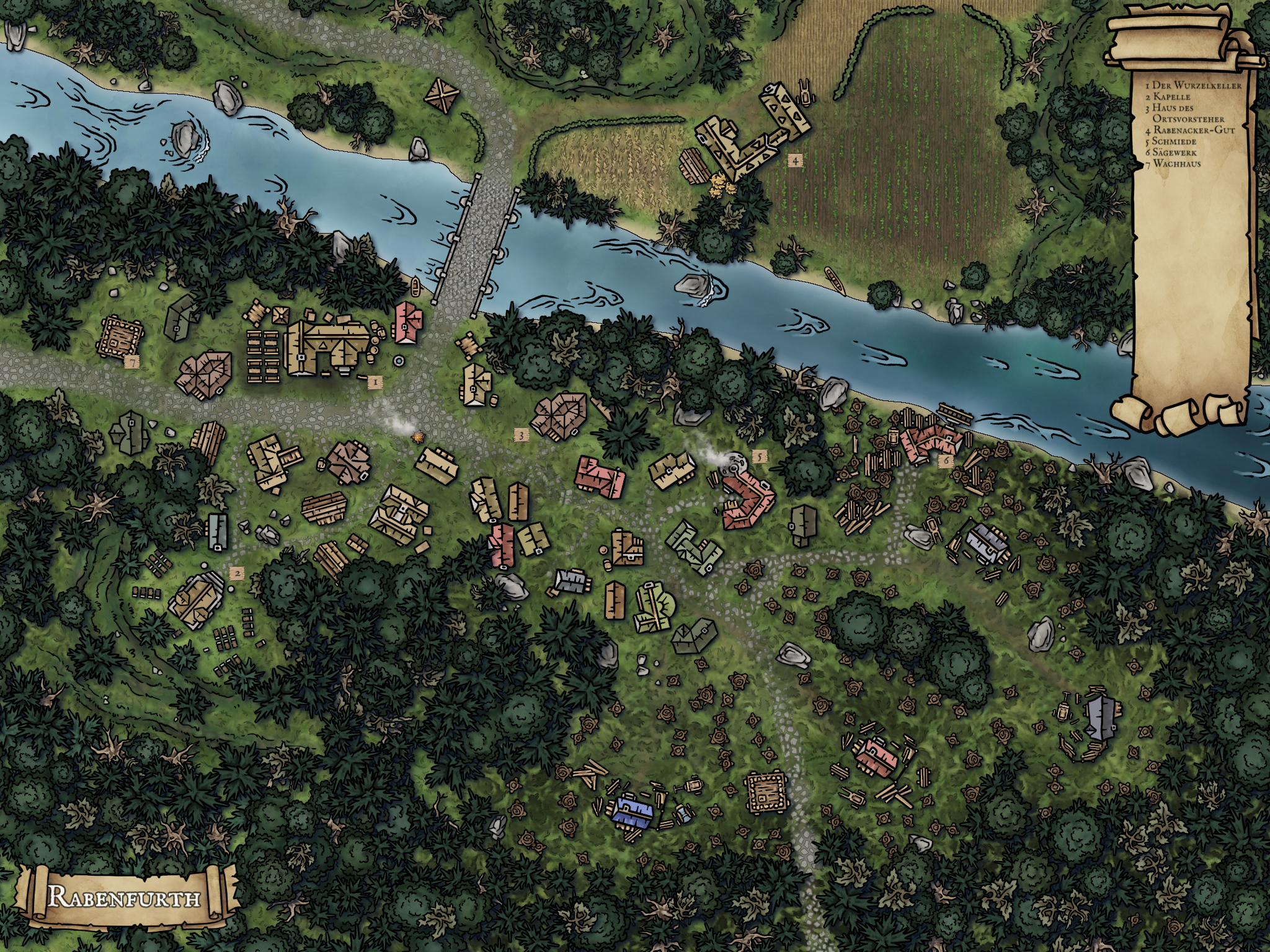 Rabenfurt ist eine kleine Holzfällersiedlung an der Grenze des alten Hains im Siegelsteiner Umland. Sie liegt direkt an der alten Handelsstraße, die durch Wald führt.
