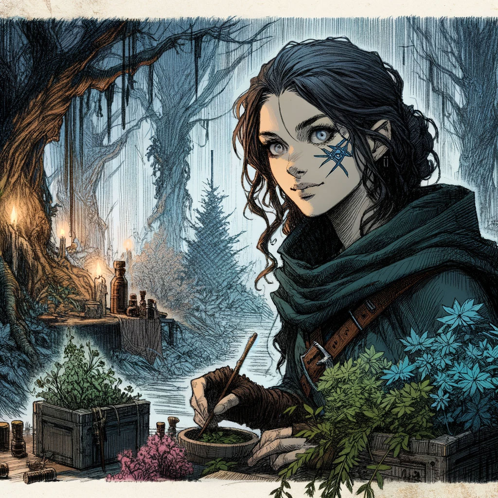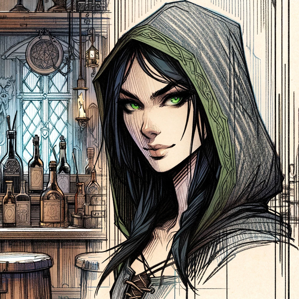 Elara Schattenstern, eine ehemalige Waldläuferin, ist eine schlanke Frau mit dunklen Haaren, die oft von einer Kapuze bedeckt sind. Ihre scharfen, grünen Augen beobachten wachsam die Gäste, während sie mit einer ruhigen, aber bestimmten Stimme spricht.