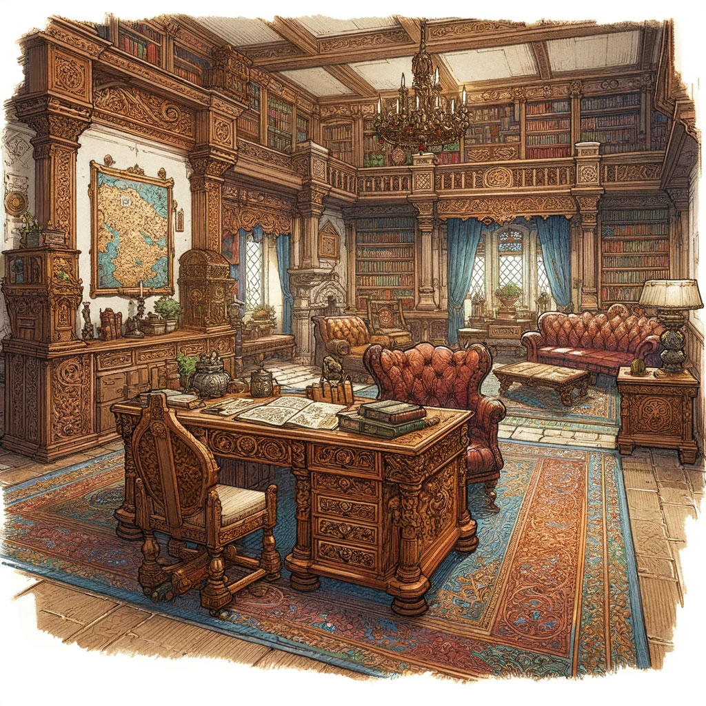 Die Innenräume strahlen eine vornehme Eleganz aus, mit kunstvollen Holzmöbeln, wertvollen Teppichen und Gemälden, die Geschichten der Vergangenheit erzählen, während das prächtige Arbeitszimmer mit seinem großen, mahagonibeschnitzten Schreibtisch und umfangreichen Büchersammlungen den Mittelpunkt bildet.