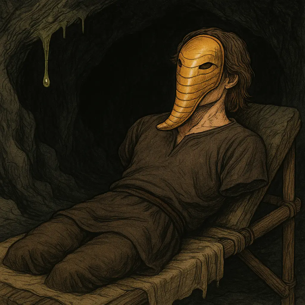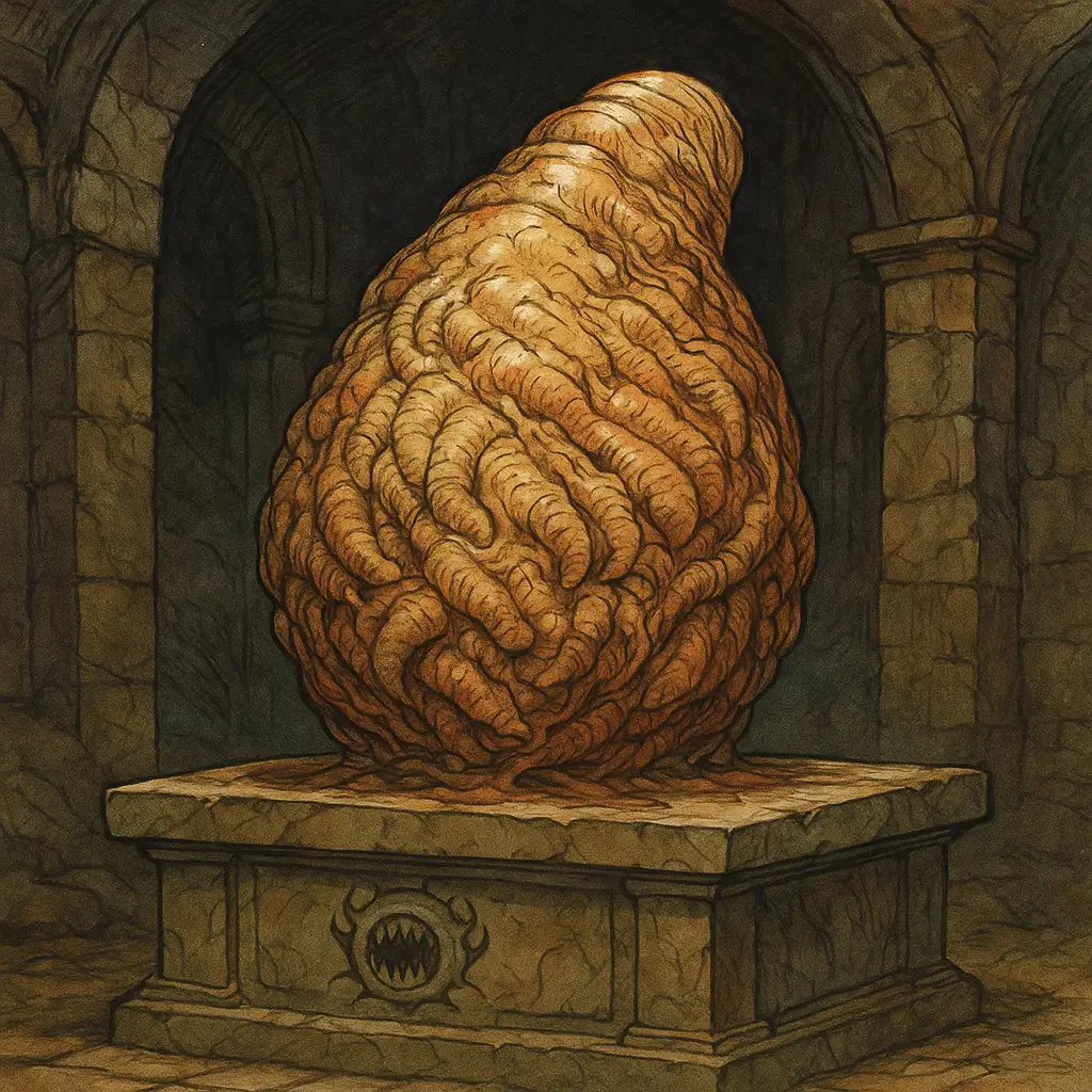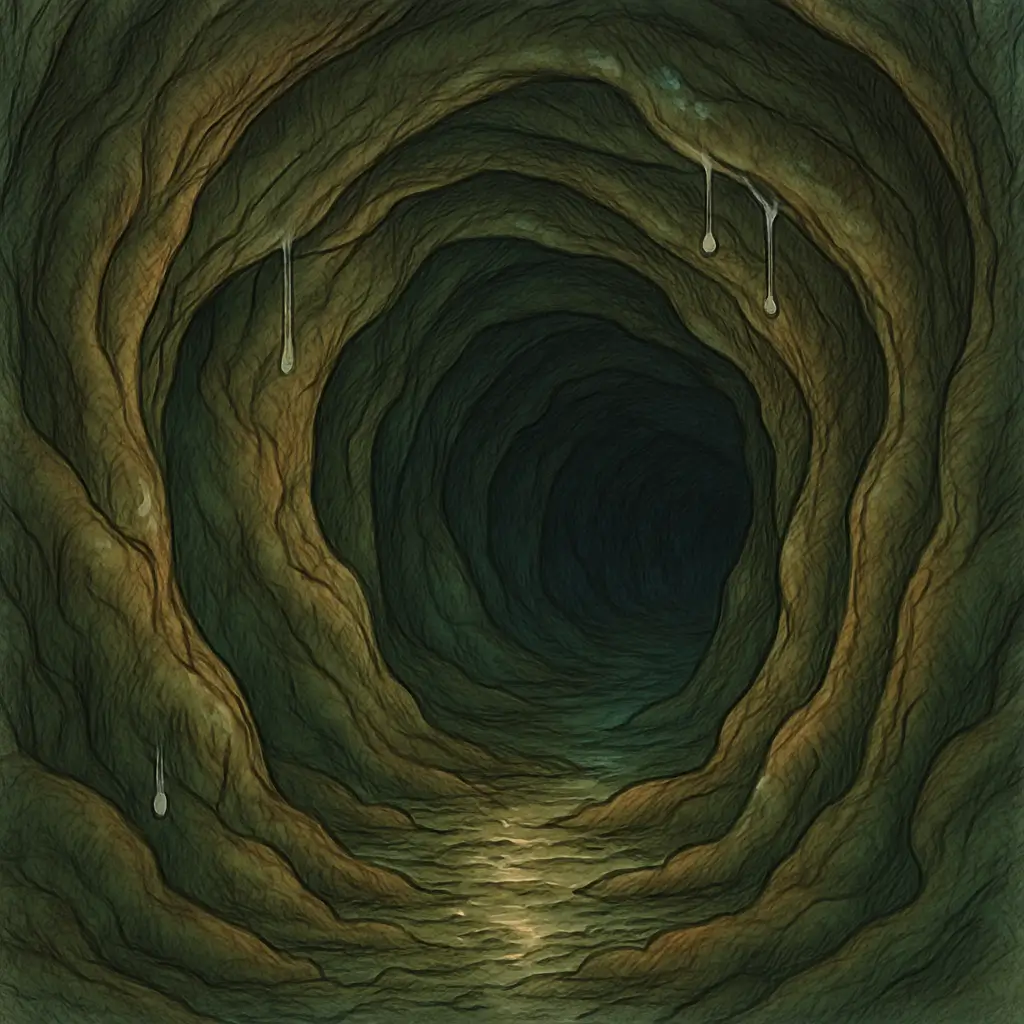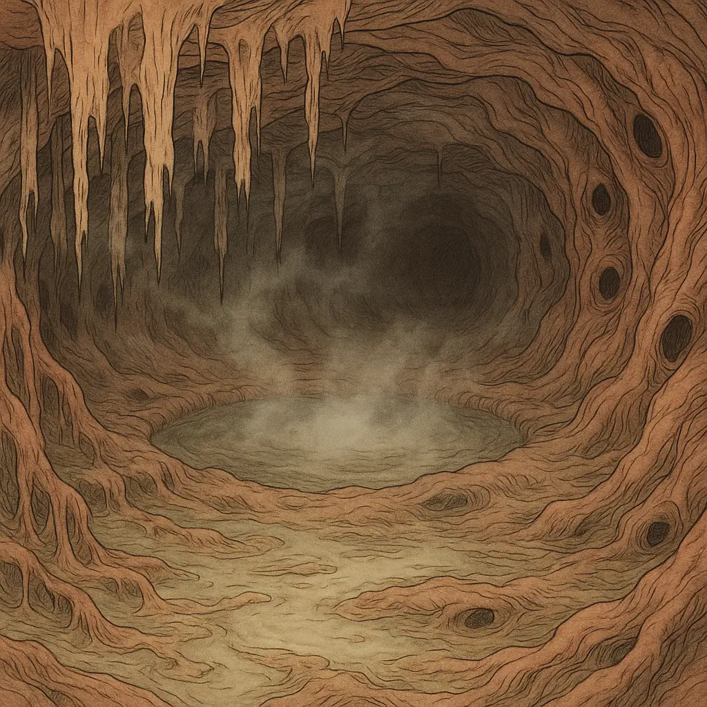 Der Eingang liegt verborgen in einem schmalen Felstunnel tief im Siebenthaler Plateau. Eine schlichte, grob gezimmerte Holztür ohne Griff steht unscheinbar im Fels, als gehörte sie nicht in diese uralte Umgebung. In der Tür ist eine flache Steinschale eingelassen, von der ein fahler Schleimfilm glänzt, der im Fackelschein leicht pulsiert. Schon wenige Schritte vor dem Eingang ist die Luft wärmer und trägt einen feinen, fauligen Geruch nach feuchter Erde. Wer genau lauscht, meint durch die dicke Tür hindurch ein tiefes, dreitöniges Summen zu hören, das wie ein ferner Herzschlag klingt.