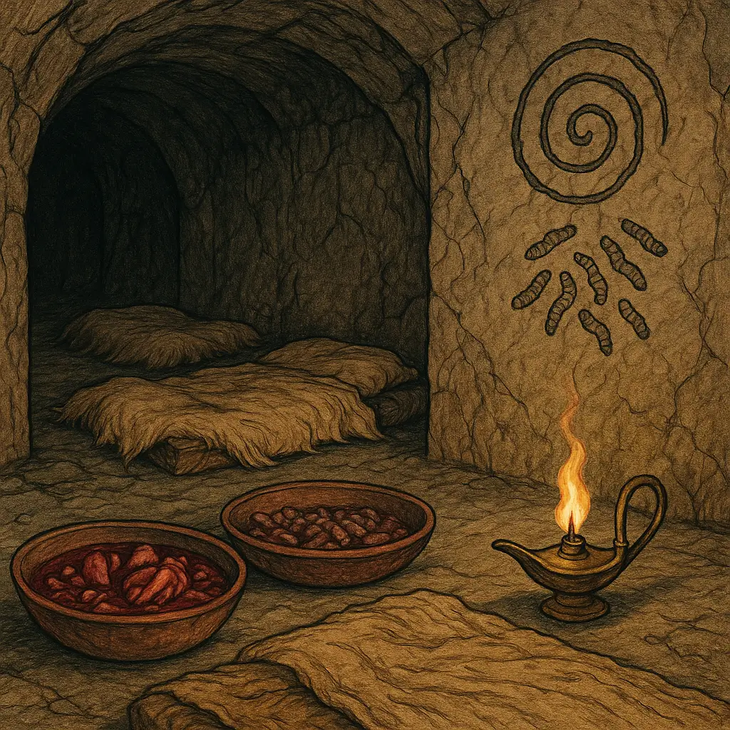 Der erste Raum ist ein Vorraum mit ausgelegten Steinplatten, deren Kanten durch jahrhundertelange Nutzung glattgeschliffen sind. In der Mitte steht eine grobe Statue einer gewaltigen Made aus graugrünem Stein, deren Oberfläche feucht glänzt und leicht zu pulsieren scheint. Die Wände sind mit eingeritzten Spiralen und Madenmotiven übersät, die teilweise mit getrocknetem Blut gefüllt wurden. Ein undefinierbarer, süßlich-modriger Geruch hängt in der Luft und wird stärker, je tiefer man vordringt. Von hier führen Tunnel weiter in das Innere unter anderem zum Geburtstümpel und einigen Schlafstätten der Kultisten .