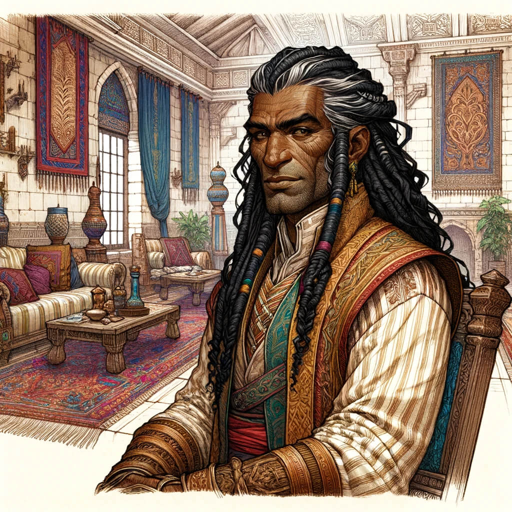 Das Familienoperhaupt der Lafduns ist Fatir, ein eleganter, älterer Mann mit dunkler Haut und langen, schwarzen Haaren, die oft kunstvoll geflochten sind. Er hat eine ruhige, aber bestimmende Ausstrahlung und ist bekannt für seine Weisheit und seinen Geschäftssinn. Fatir führt die Familie und das Geschäft mit einer Mischung aus traditionellen Werten und moderner Innovation. Er stammt aus einer langen Linie von Gewürzhändlern und hat seine Familie zu neuer Blüte geführt.