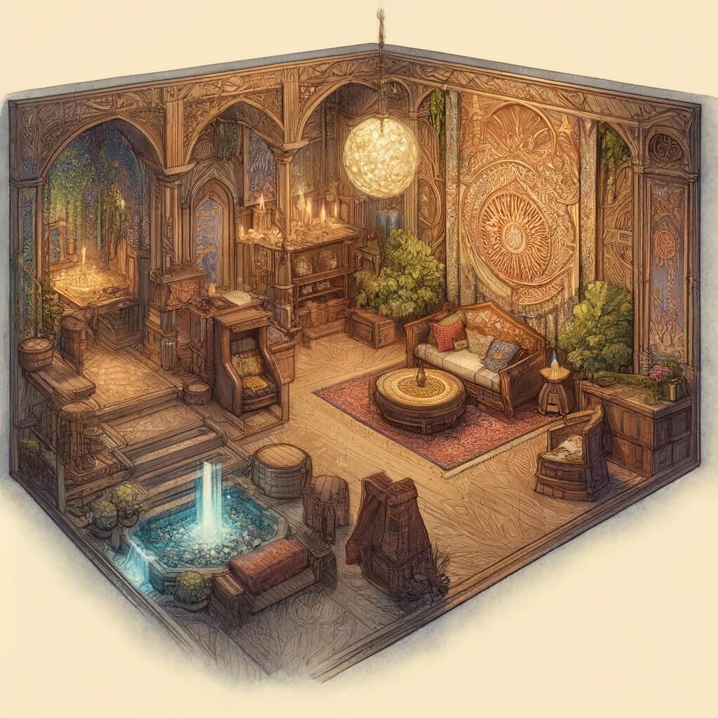 Die Innenräume der elfischen Gebäude sind ebenso beeindruckend wie ihre äußere Erscheinung. Hohe Decken, von denen leuchtende Kristalle hängen, erleuchten die Räume sanft, während Wände mit fein gearbeiteten Wandteppichen und Kunstwerken geschmückt sind, die Szenen aus elfischer Mythologie und Natur darstellen. Möbel aus edlem Holz und mit feinen Stoffen bezogen, bieten einen Ort der Entspannung und des Austauschs. In den Wohnhäusern findet man Räume, die speziell für Meditation und Entspannung vorgesehen sind, umgeben von beruhigenden Wasserläufen und lebenden Pflanzen. Selbst die Handels- und Handwerksläden sind mit einer Liebe zum Detail gestaltet, die das tiefe Verständnis der Elfen für Schönheit und Harmonie widerspiegelt.
