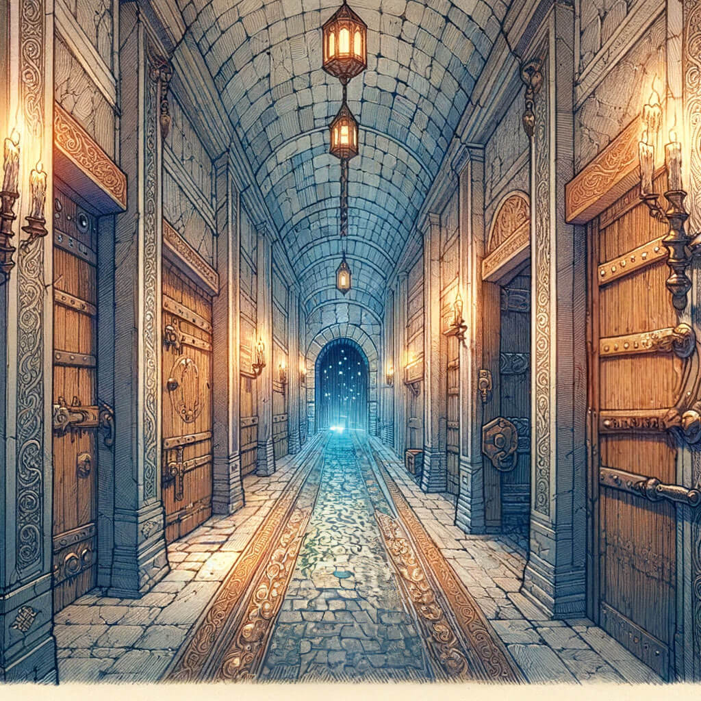 Türen ohne Knauf säumen die Wände und öffnen sich wie von Geisterhand für jene, die die Erlaubnis zum Eintritt haben. Die Türen innerhalb der Magiergilde von Siegelstein besitzen nicht nur die bemerkenswerte Eigenschaft, sich ohne physische Berührung zu öffnen, sondern können auch im Geiste mit denjenigen sprechen, die sich ihnen nähern. Dieser Zauber, bekannt als „Flüstern der Pforten“, wurde von den Gildenmagiern entwickelt, um eine zusätzliche Ebene der Sicherheit und Personalisierung zu bieten. Die Türen sind in der Lage, die Absichten und manchmal sogar die emotionalen Zustände der Personen zu erkennen, die Einlass begehren, und passen ihre Reaktionen entsprechend an. Sie können Neugierige warnen, Unbefugte abweisen oder Suchenden Hinweise geben.