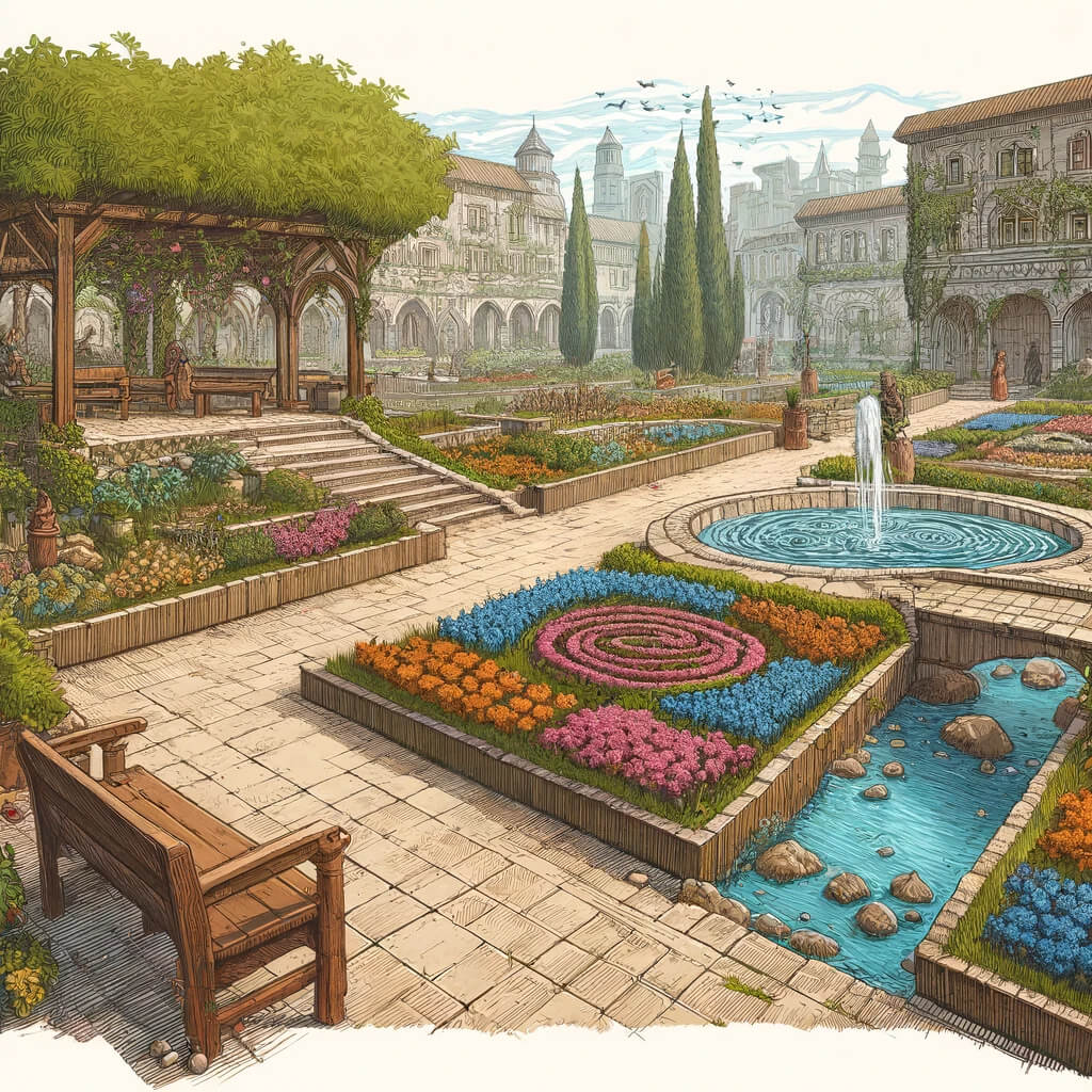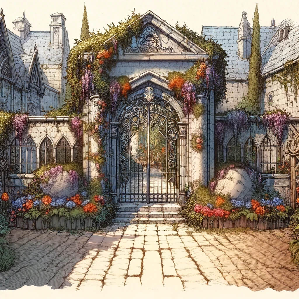 Der Garten der Reflexion ist eine Oase der Ruhe innerhalb der geschäftigen Oberstadt von Weidenburg. Umgeben von einer Mauer und einem kunstvoll geschmiedeten Eisenzaun, der Einblicke in das Innere gewährt, zieht dieser Ort schon von außen die Blicke auf sich. Der Eingang ist ein großes kunstvoll geschmiedetes Eisentor. Blühende Kletterpflanzen und duftende Blumen umranken den Zaun und verleihen dem Ort ein einladendes, friedliches Flair.