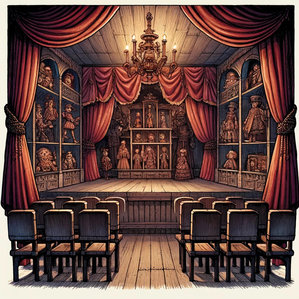 Innen ist das Theater eine Welt für sich, mit schweren roten Samtvorhängen, die die Wände bedecken, und einer kleinen, aber tiefen Bühne. Der Raum ist mit Reihen alter Holzstühle ausgestattet, die knarren, wenn man sich darauf setzt. An der Decke hängen kleine, kunstvolle Kronleuchter, die ein schummriges Licht auf die Bühne werfen. Hinter der Bühne befinden sich zahlreiche Schränke voller Puppen in verschiedenen Kostümen und Größen, jede mit einem eigenen Charakter. Die Luft ist erfüllt vom Duft von altem Holz und Staub, gemischt mit dem Aroma von Lampenöl.