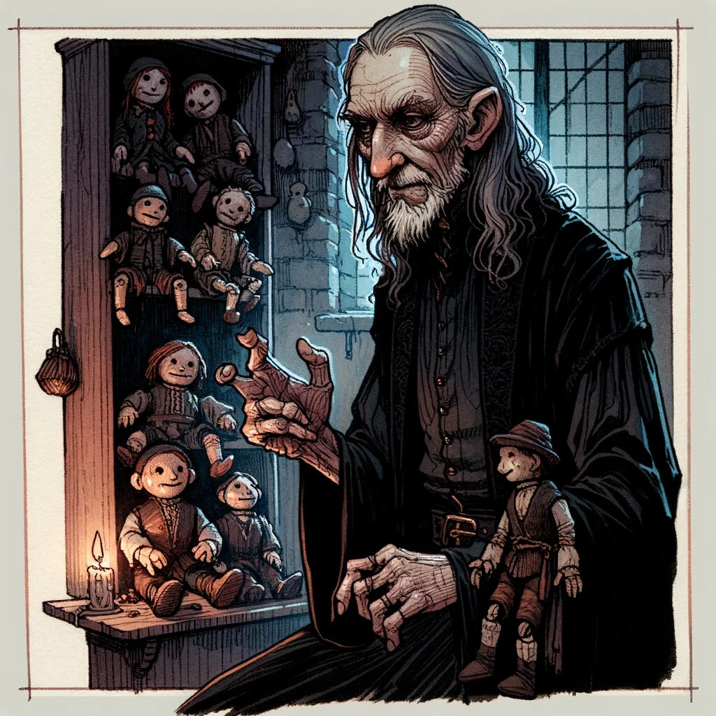 Das Theater wird von Viktor Dunkelstrang, einem älteren menschlichen Puppenspieler, geführt. Viktor ist ein schlanker Mann mit tief liegenden Augen und langen, geschickten Fingern, die perfekt für sein Handwerk sind. Seltsamerweise scheinen seine Hände aus Holz zu sein, die er auf beliebige Weise verrenken kann. Er trägt meist schwarze, etwas abgetragene Kleidung, die ihm ein geheimnisvolles Aussehen verleiht. Seine tiefe, ruhige Stimme und seine Vorliebe für düstere Geschichten machen ihn zu einer faszinierenden, wenn auch etwas unheimlichen Persönlichkeit. Viktor ist bekannt dafür, dass er mit seinen Puppen spricht, als wären sie lebendig.