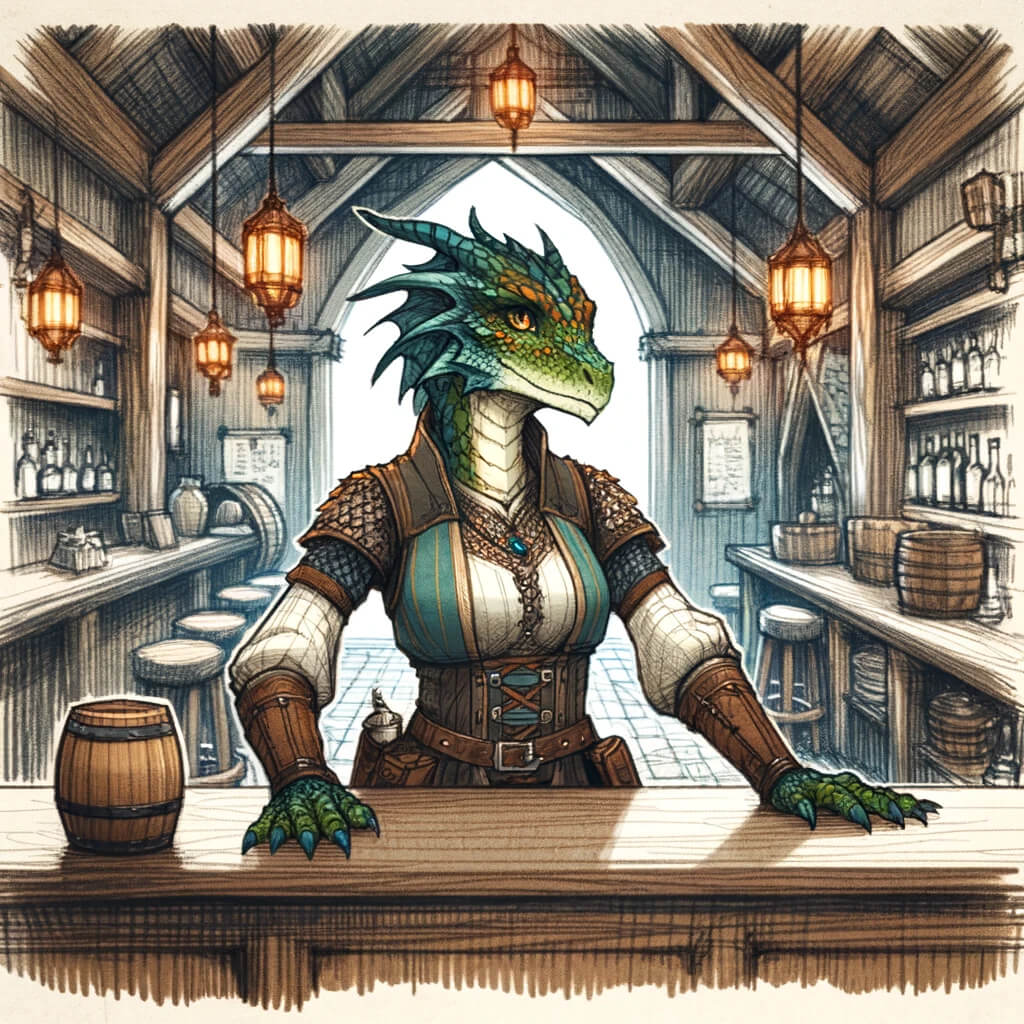Die Taverne wird von Zaahra Schimmerschuppe, einer jungen Drakkin mit einem türkis schimmernden Schuppen und wachen, klugen Augen geführt. Zaahra ist bekannt für ihre freundliche Art und ihre Fähigkeit, mit jedem Gast ein Gespräch zu führen. Sie liebt es den Geschichten ihrer Gäste zu lauschen.