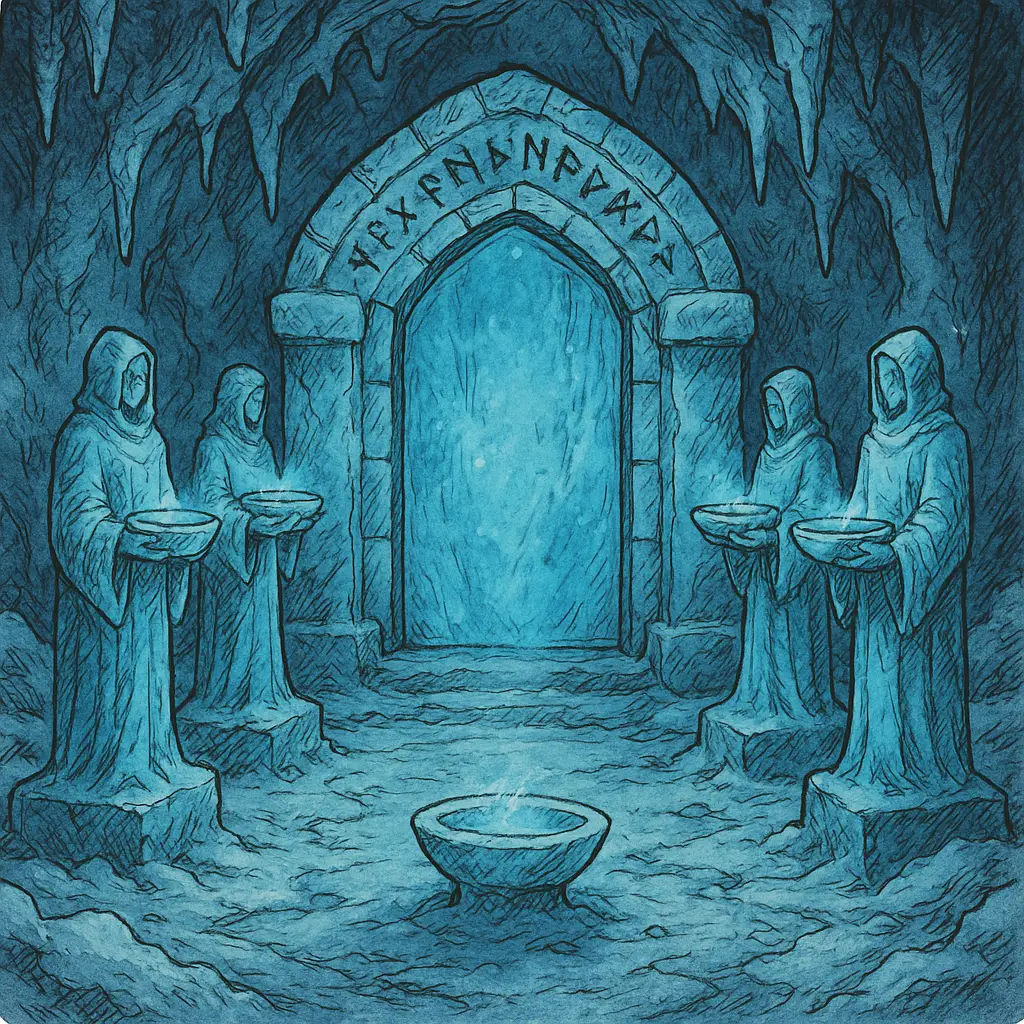 - Der Schrein der Tochter des Schnees ist eine halbkreisförmige, aus Eiskristallen gewachsene Struktur, in deren Zentrum eine schlanke Statue aus glitzerndem Frostglas steht, die Hände zum Himmel erhoben, während sich feine Schneeflocken wie in Zeitlupe um sie drehen. Vor ihr steht ein kleines Becken gefüllt mit eiskaltem Wasser, der allerdings nicht gefriert.