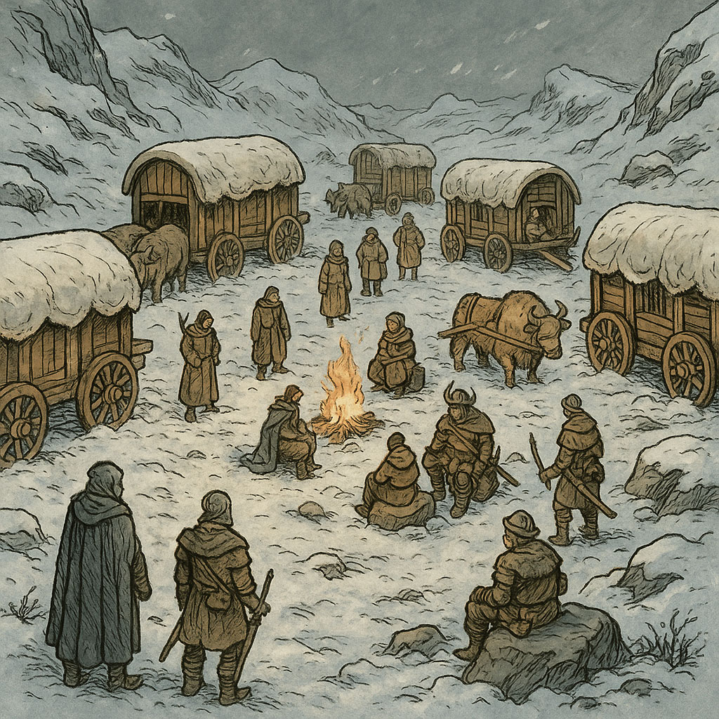 Die Karawane ist ein Versorgungs- und Handelszug, der regelmäßig zwischen Siedlungen und entlegenen Außenposten in den Nordlanden verkehrt – eine der wenigen Lebensadern durch das gefrorene Land. Sie transportiert Lebensmittel, Medizin, Werkzeuge, Metalle, Pelze und manchmal Personen. Das aktuelle Ziel: eine der größten Städte, Eiswindhafen, direkt an der westlichen Küste gelegen.
