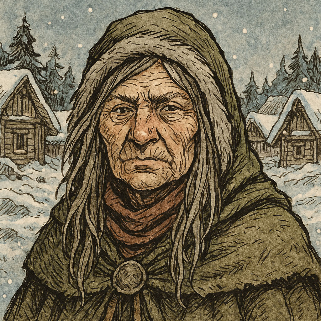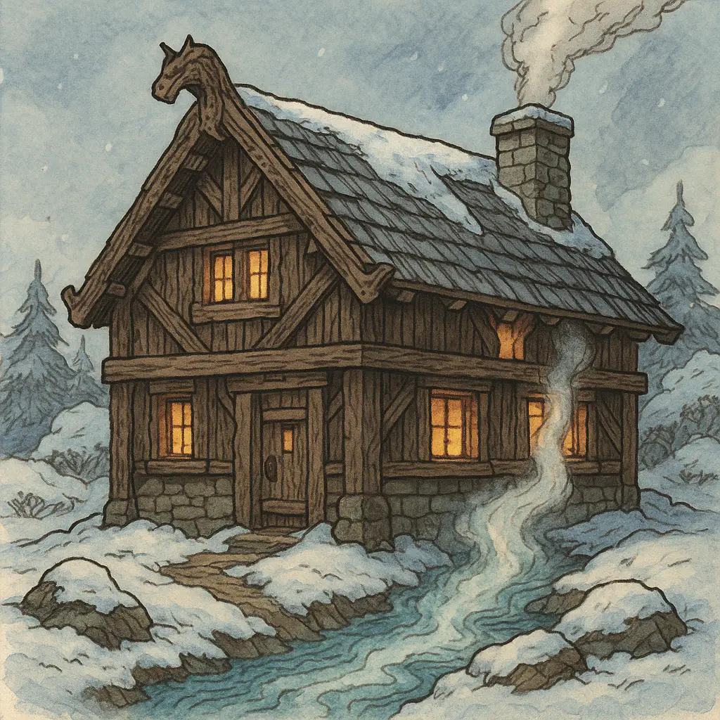 - Eine niedrige Hütte aus dunklem Holz mit einem Steindach, das im Winter nie ganz schneefrei wird – ein heißer Bach führt direkt unter dem Fundament hindurch und spendet behagliche Wärme. Innen hängen getrocknete Kräuter von der Decke und ein Feuer knistert.