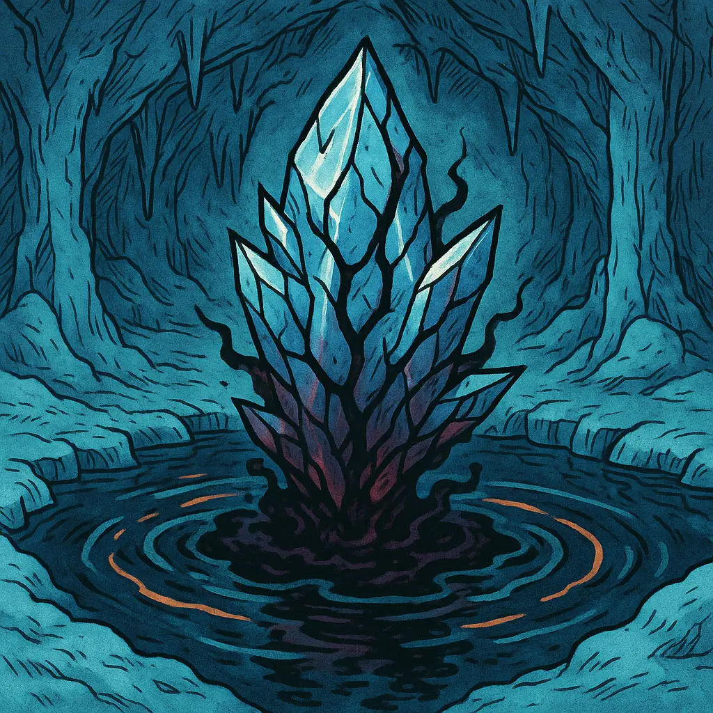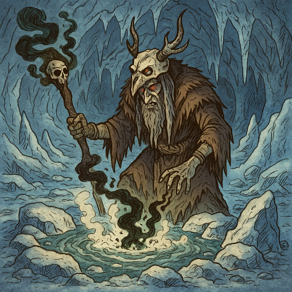 - Spielleiterhinweis: Sie stammen aus einem Dorf namens Grimstetten, das „in einer Nacht erfror“. Ihre Geschichten sind wirr: Sie berichten von „einem Riss im Himmel“, „gefrorenen Herzen“ und dass „die Toten dort bewegen sich“. Einer trägt eine Statue aus grünlich schimmerndem Eis, sie pulsiert schwach.