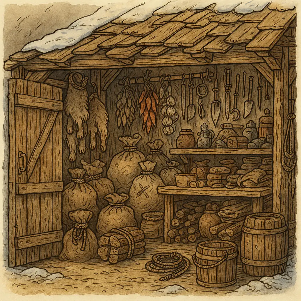 - Ein schiefes Gebäude mit doppelter Tür und durchhängendem Dach, vollgestopft mit Fellen, getrocknetem Gemüse, Werkzeugen, Seilen und Kram. Drinnen riecht es nach altem Metall und Räucherschinken.