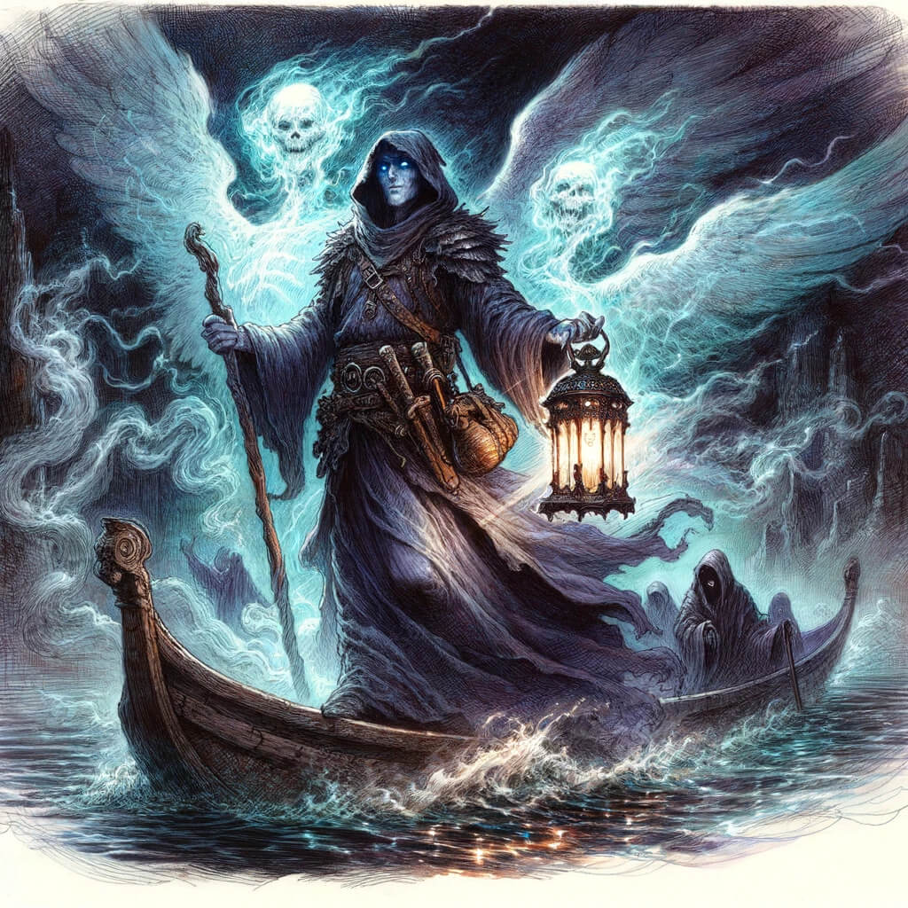 Der Strom des Vergessens windet sich durch eine schaurige, nebelverhangene Landschaft, die von verzerrten, verdorrten Bäumen gesäumt ist, deren knorrige Äste wie knöcherne Finger in den grauen Himmel ragen. Immerzu schwebt ein kühler, bleicher Dunst über den trüben Wassern, in denen die gesichtslosen, vermummten Gestalten der Seelen auf ihren schmalen, dunklen Fähren gemächlich dahingleiten. Über all dem liegt das Lied der Toten – eine leise, melancholische Melodie, die wie aus den Tiefen des Flusses selbst emporzusteigen scheint. Sie ist stets zu hören, ein unaufhörlicher, sanfter Gesang, der in harmonischen Wellen durch die neblige Luft hallt und die Trauer und den Frieden des ewigen Übergangs in die Ätherflut verkörpert. Schattenhafte Vögel mit toten Schädeln schweben lautlos über dem Fluss, ein stummer Wächterchor, der über die Reise der Seelen wacht. Die Wolken verbergen hier und da die schwebenden, geisterhaften Gestalten von Seelen, die auf ihre endgültige Reise vorbereitet werden. Die Landschaft ist durchzogen von einer mystischen Aura, die an der Schwelle zwischen den Welten schwebt, wo die Grenze zwischen Leben und Tod kaum spürbar ist.